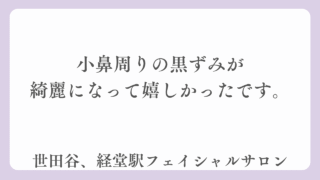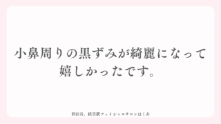 フェイシャルエステご利用の声 小鼻周りの黒ずみが綺麗になって嬉しかったです。 世田谷、経堂駅の毛穴専門フェイシャルサロンはくあで毛穴洗浄で小鼻周りの黒ずみがキレイになられたお客様の事例を紹介している記事になります。 フェイシャルエステご利用の声