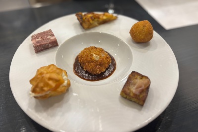 さつまいものキッシュ、豚耳のパンケーキ、パテドカンパーニュ、スモークサーモンのシュー、特製メンチカツ、茸のリゾットコロッケ